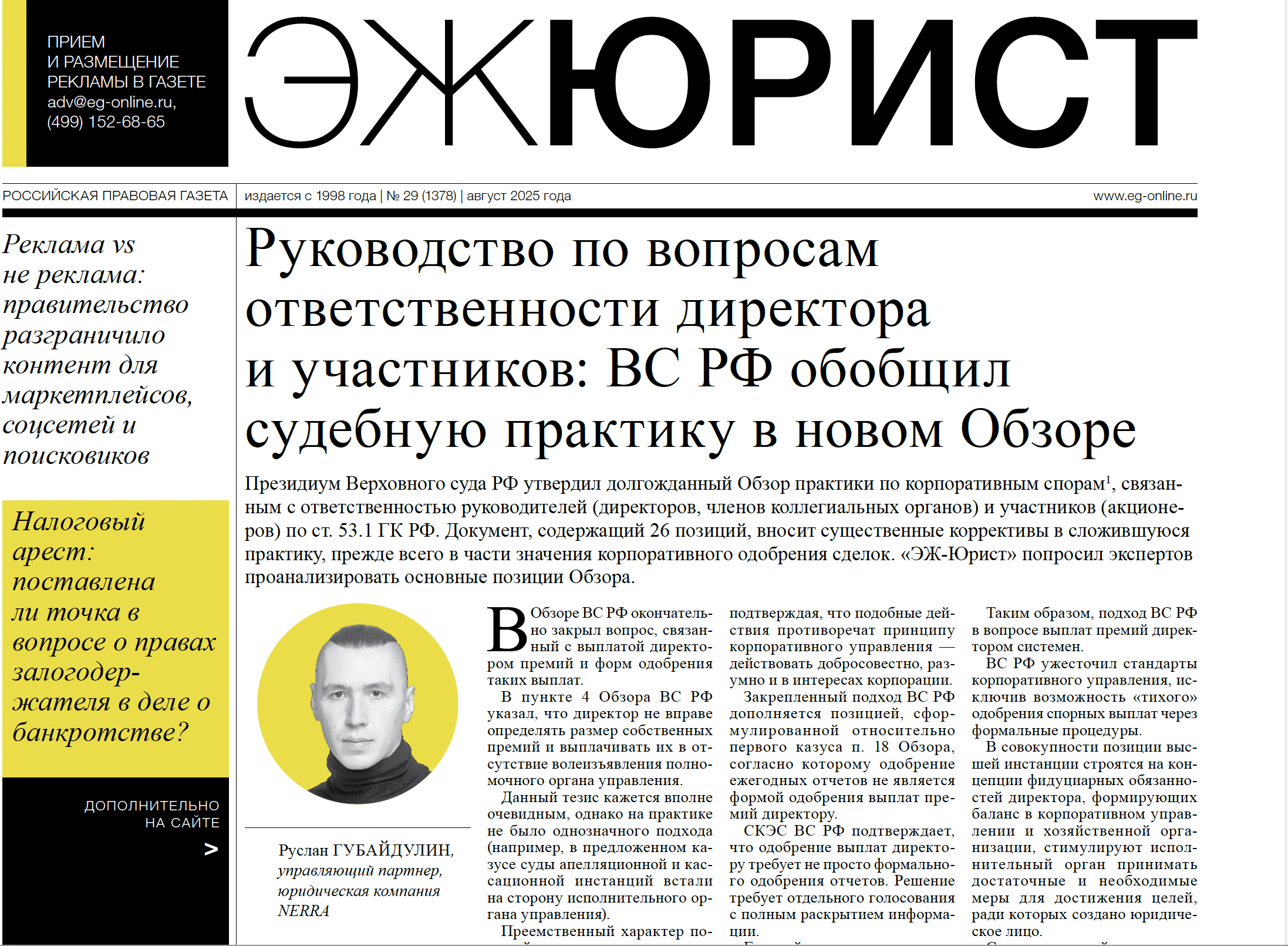 Президиум Верховного суда РФ утвердил долгожданный Обзор практики по корпоративным спорам1, связанным с ответственностью руководителей (директоров, членов коллегиальных органов) и участников (акционеров) по ст. 53.1 ГК РФ. Документ, содержащий 26 позиций, вносит существенные коррективы в сложившуюся практику, прежде всего в части значения корпоративного одобрения сделок. «ЭЖ-Юрист» попросил экспертов проанализировать основные позиции Обзора.