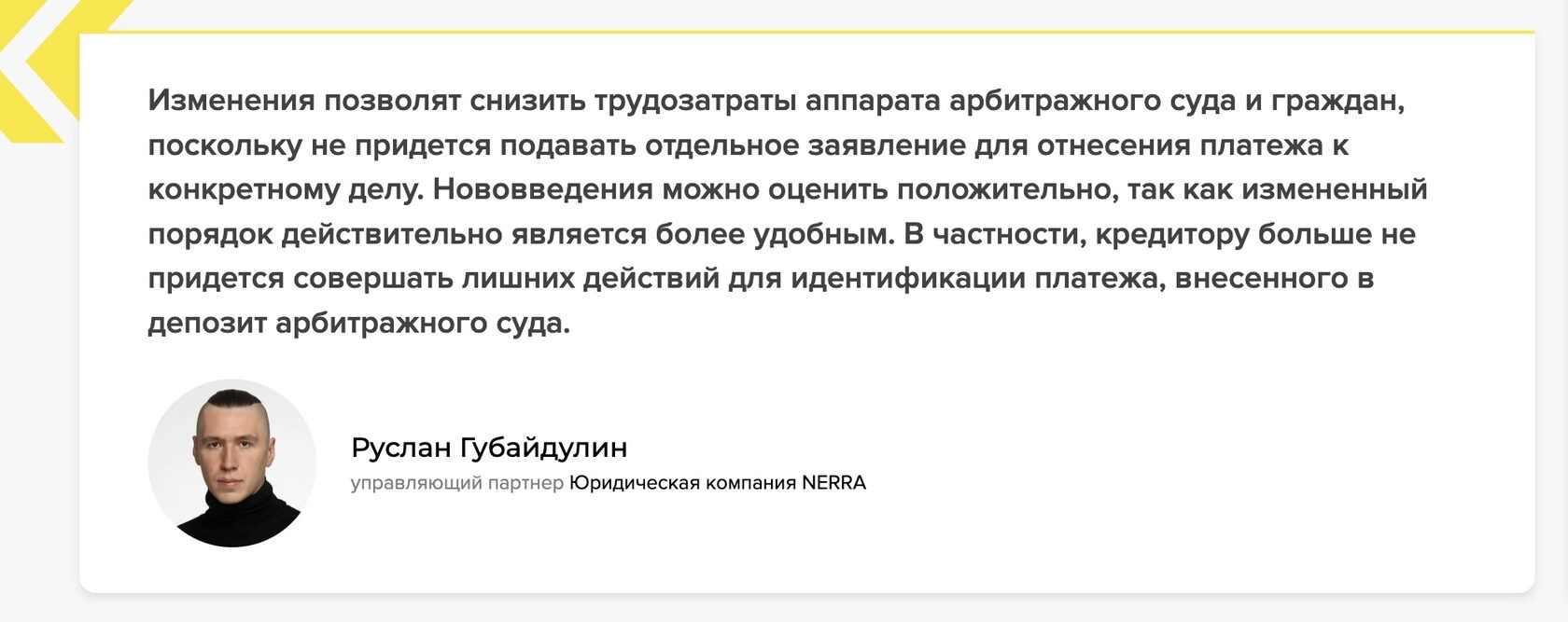 Изменения, которые предлагается включить в Федеральный закон «О несостоятельности (банкротстве)», призваны упростить порядок внесения денежных средств в депозит арбитражного суда, отметил Руслан Губайдулин, управляющий партнер Юридической компании NERRA.