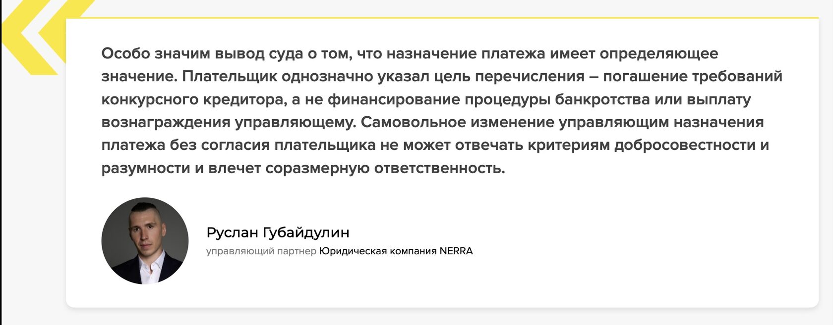 Вывод суда формирует важную позицию относительно обязанностей конкурсного управляющего при получении денежных средств от третьих лиц, не являющихся участниками дела о банкротстве, отметил Руслан Губайдулин, управляющий партнер Юридической компании NERRA.