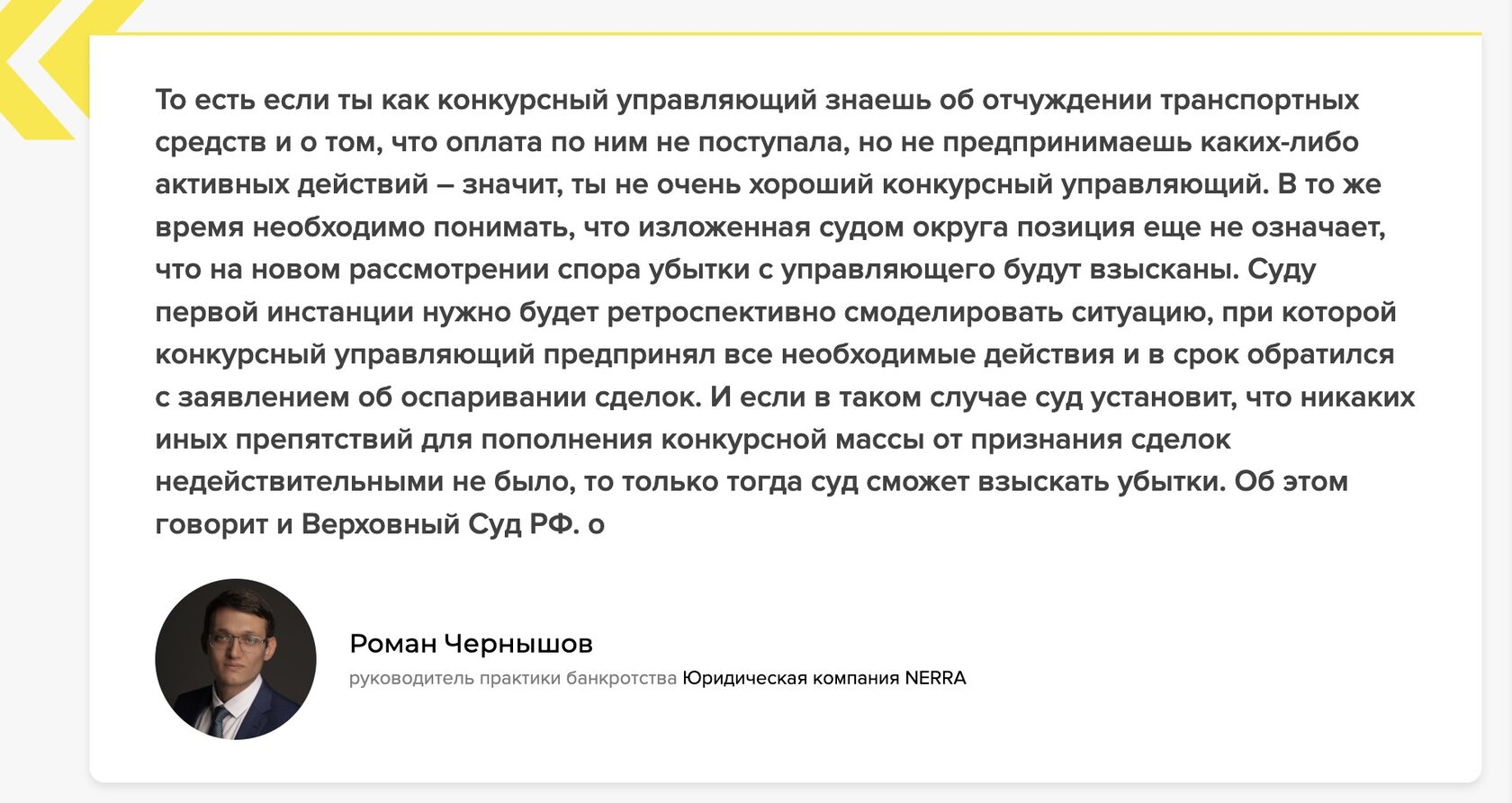 То есть если ты как конкурсный управляющий знаешь об отчуждении транспортных средств и о том, что оплата по ним не поступала, но не предпринимаешь каких-либо активных действий – значит, ты не очень хороший конкурсный управляющий. В то же время необходимо понимать, что изложенная судом округа позиция еще не означает, что на новом рассмотрении спора убытки с управляющего будут взысканы. Суду первой инстанции нужно будет ретроспективно смоделировать ситуацию, при которой конкурсный управляющий предпринял все необходимые действия и в срок обратился с заявлением об оспаривании сделок. И если в таком случае суд установит, что никаких иных препятствий для пополнения конкурсной массы от признания сделок недействительными не было, то только тогда суд сможет взыскать убытки. Об этом говорит и Верховный Суд РФ. о