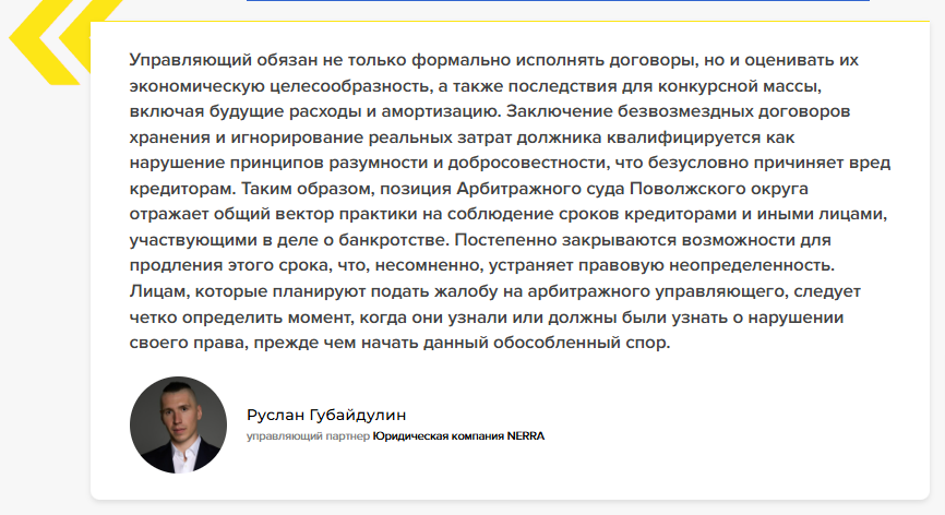 Кассация подтвердила, что пассивное ожидание исхода спора о законности действий управляющего не гарантирует возможности взыскания с него убытков в будущем при пропуске общего срока исковой давности. Одновременно суд не оставил без внимания высокий стандарт поведения арбитражного управляющего при ведении хозяйственной деятельности должника в конкурсном производстве, подчеркнул Руслан Губайдулин.