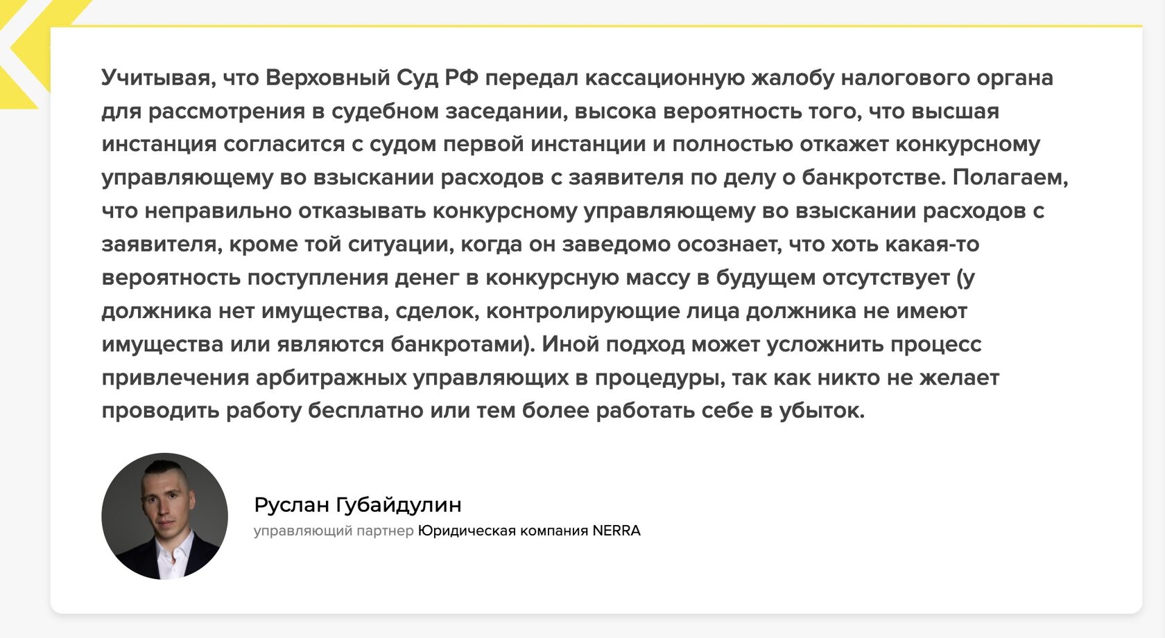 В переданном в Верховный суд РФ деле будет рассмотрен порядок возмещения расходов конкурсным управляющим в процедуре банкротства, отметил Руслан Губайдулин, управляющий партнер Юридической компании NERRA.